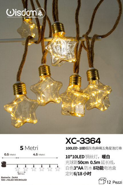 Catena luminosa 10 stelle integranti 100LED luce calda da 5 metri alimentazione a pile