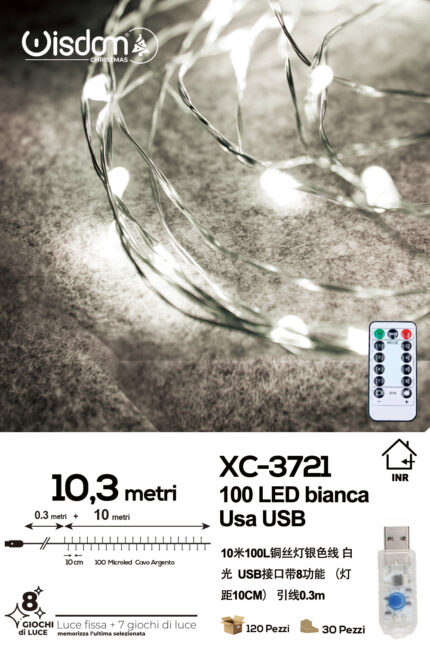 Catena luminosa 100 microLED luce bianca da 10,3 metri alimentazione usb con telecomando 8 giochi luce per uso interno