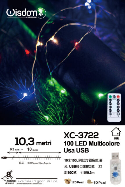 Catena luminosa 100 microLED luce muticolor da 10,3 metri alimentazione usb con telecomando 8 giochi luce per uso interno