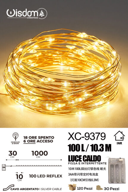 Catena luminosa 100 microLED REFLEX luce calda fissa e intermittente da 10,3 metri alimentazione a pile per uso interno con funzione timer on-off
