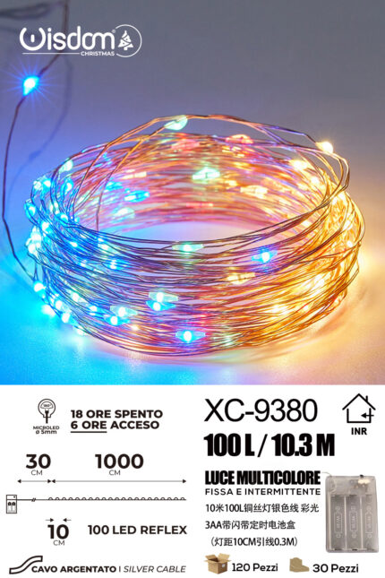 Catena luminosa 100 microLED REFLEX luce multicolor fissa e intermittente da 10,3 metri alimentazione a pile per uso interno con funzione timer on-off