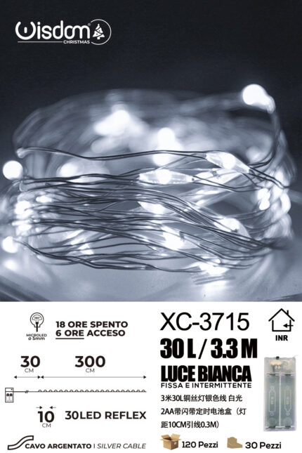 Catena luminosa 30 microLED REFLEX luce bianca fissa e intermittente da 3,3 metri alimentazione a pile per uso interno con funzione timer