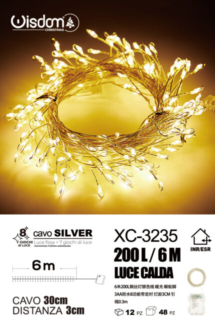 Catena luminosa da 200 microLED luce bianca 6 metri alimentazione a pile ip44 per uso interno esterno con 8 giochi luce