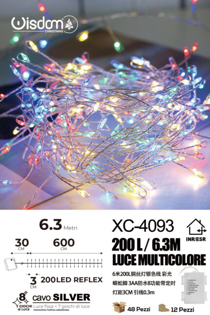 Catena luminosa da 200 microLEDREFLEX luce multicolor 6,3 metri alimentazione a pile ip44 per uso interno esterno con 8 giochi luce