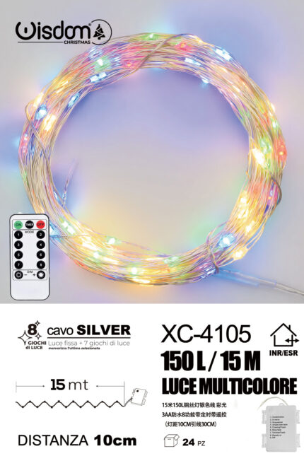 Catena luminosa con telecomando da 150 microLED luce multicolor 15 metri alimentazione a pile ip44 per uso interno esterno con 8 giochi luce