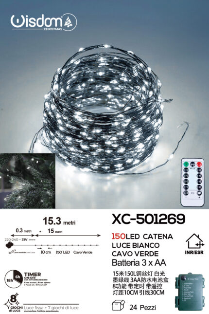 Catena luminosa con telecomando da 150 microLED luce bianca 15,3 metri alimentazione a pile ip44 per uso interno esterno con 8 giochi luce