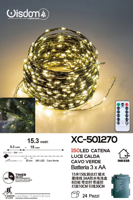 Catena luminosa con telecomando da 150 microLED luce calda 15,3 metri alimentazione a pile ip44 per uso interno esterno con 8 giochi luce