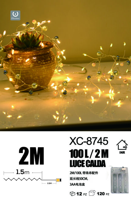 Catena luminosa decorativa da 2 metri luce calda con 100 micro LED alimentazione a batteria