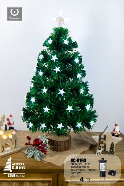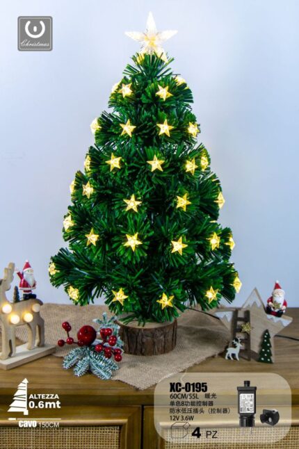 Albero in fibra ottica 55 LED luce Calda , con stelle luminose , controller a 8 funzioni, 60 cm, base legno
