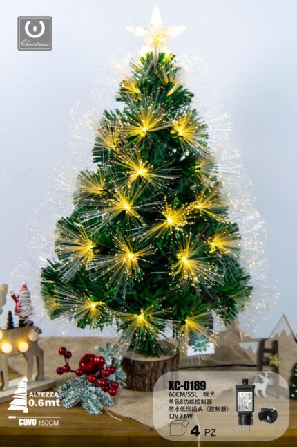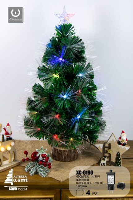Albero in fibra ottica 55 LED luce multicolor , con controller a 8 funzioni, 60 cm, base legno