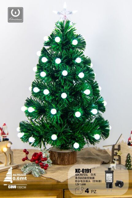 Albero in fibra ottica 55 LED luce Bianca , con palline luminose , controller a 8 funzioni, 60 cm, base legno