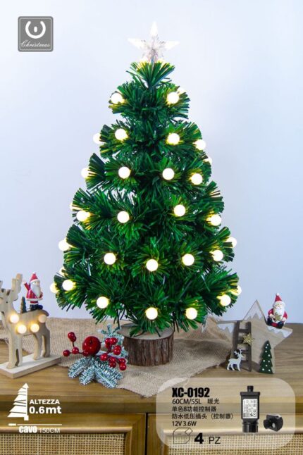 Albero in fibra ottica 55 LED luce Calda , con palline luminose , controller a 8 funzioni, 60 cm, base legno