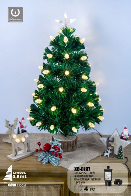Albero in fibra ottica 55 LED luce Calda , con pigne luminose , controller a 8 funzioni, 60 cm, base legno