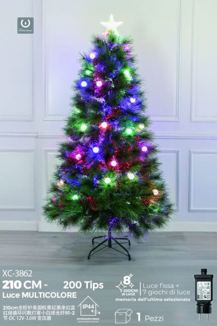 Albero in fibra ottica aghi di pino con palline luminose multicolor , controller a 8 funzioni, di luce 210 cm