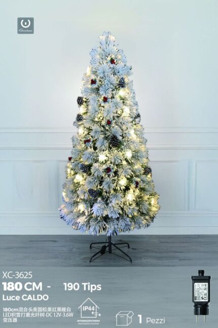 Albero in fibra ottica Bianco Caldo,con aghi di pino bianco e pigne ,190 punte , 180 cm