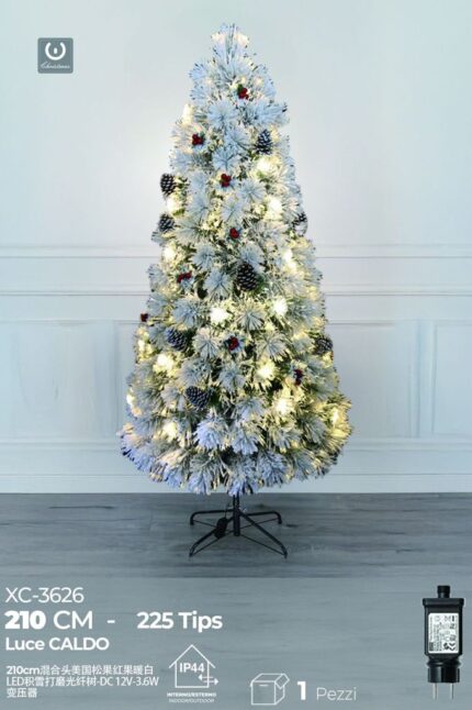 Albero in fibra ottica Bianco Caldo,con aghi di pino bianco e pigne ,225 punte , 210 cm