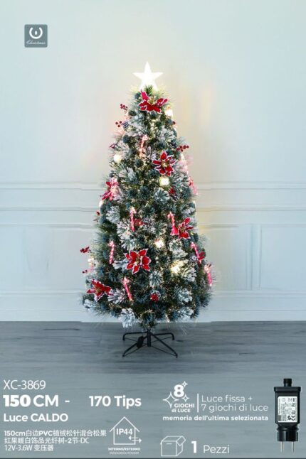 Albero in fibra ottica Bianco Caldo,con aghi di pino e pigne con bordo bianco,170 punte ,8 giochi di luce , 150 cm