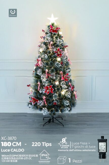 Albero in fibra ottica Bianco Caldo,con aghi di pino e pigne con bordo bianco,220 punte ,8 giochi di luce , 180 cm