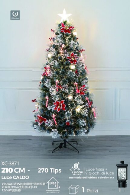 Albero in fibra ottica Bianco Caldo,con aghi di pino e pigne con bordo bianco,270 punte ,8 giochi di luce , 210 cm