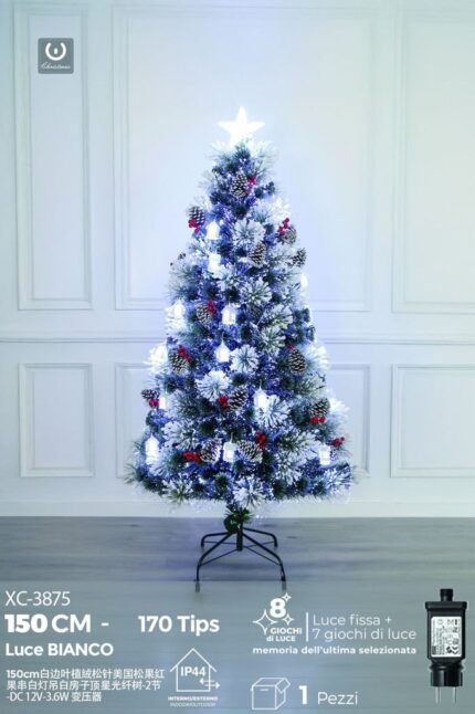 Albero in fibra ottica Luce Bianca 8 giochi di luce ,con aghi di pino con bordo bianco 170 punte , pigne , bacche , luci Bianche ,150 cm