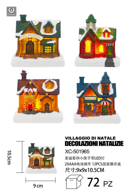 Set 4 piccole case Natalizie in resina con luci LED (10,5cmH)
