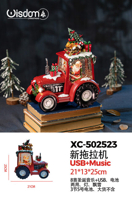 Trattore Natalizio + Babbo natale con effetto neve che cade carillon luci 8 musiche Natalizie+Ingresso USB (25cmH) alimentazione a batterie