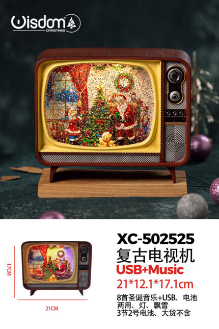 Televisore retrรฒ Natalizio + Babbo natale con effetto neve che cade carillon luci 8 musiche Natalizie+Ingresso USB (17cmH) alimentazione a batterie