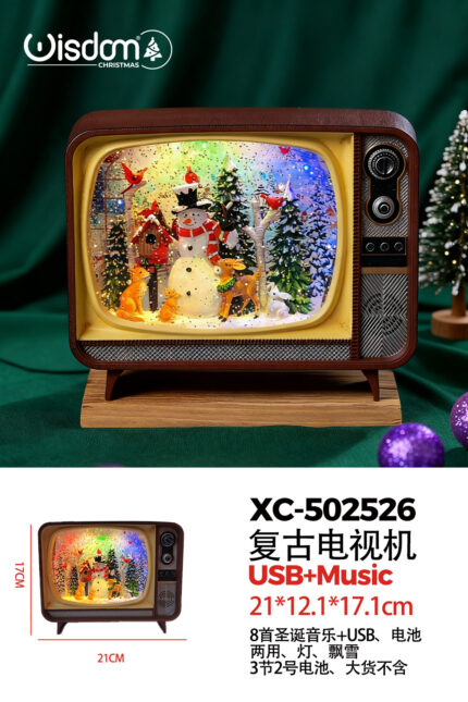 Televisore retrรฒ Natalizio + Pupazzo di neve con effetto neve che cade carillon luci 8 musiche Natalizie+Ingresso USB (17cmH) alimentazione a batterie