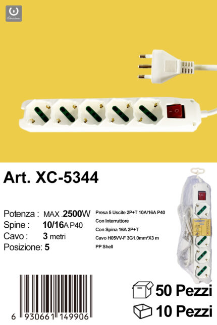Ciabatta presa bipasso a cinque posizioni cavo da 3 metri potenza max 2500w con prese uscite da 10 e 16A