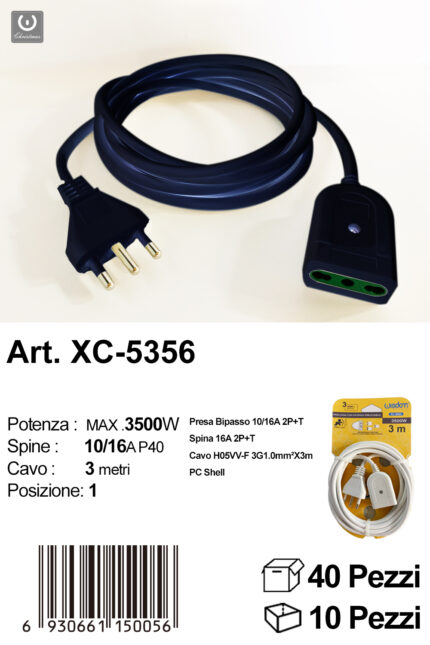 Prolunga elettrica bipasso con spina e presa da 16A lunghezza cavo 5 metri
