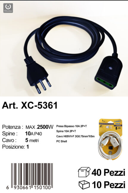Prolunga elettrica colore nero da 5 metri con potenza massima di 2500W
