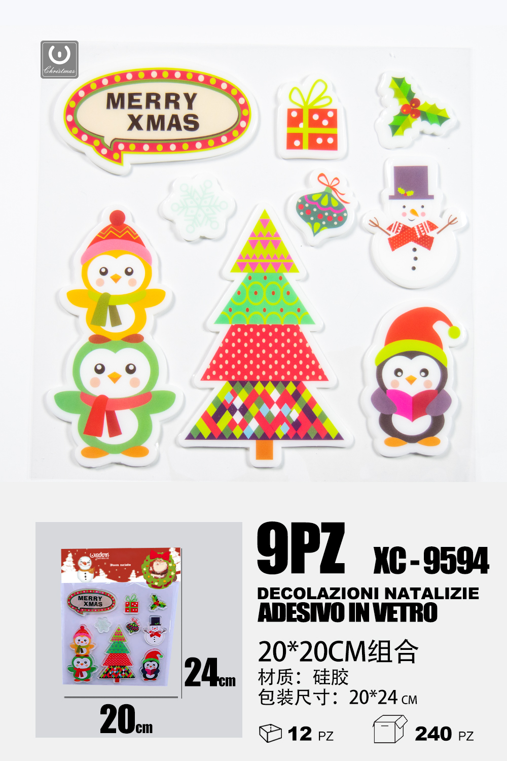 9 Adesivi in gel per decorazioni natalizie forme personaggi natalizi dimensione 20x24cm ideale da attaccare su finestre e vetrine