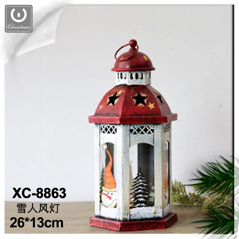 Addobbo decorativo Natalizio lanterna esagonale bianca e rossa in metallo e vetro con Pupazzo di neve dimensioni 26x13cm