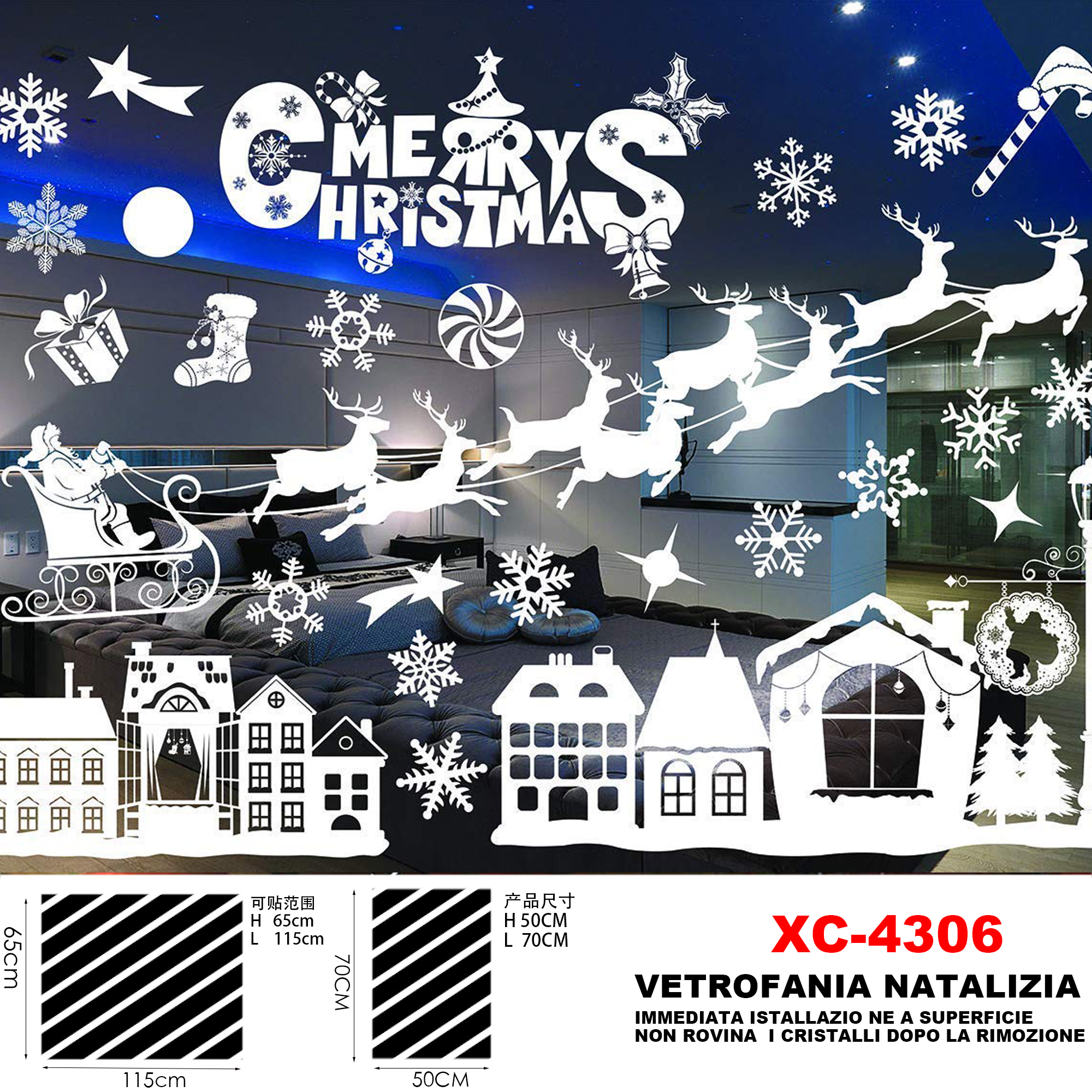 Adesivi natalizi con sfondo Merry christmas e paesaggi in pvc per finestre e decorazioni dimensioni 50x70cm