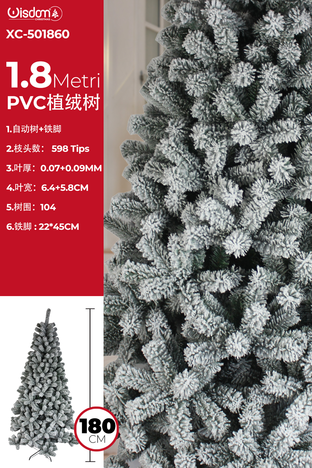 Albero di natale artificiale altezza 1,8 metri con 598 punte decorate bianche effetto neve base in ferro 22x45cm