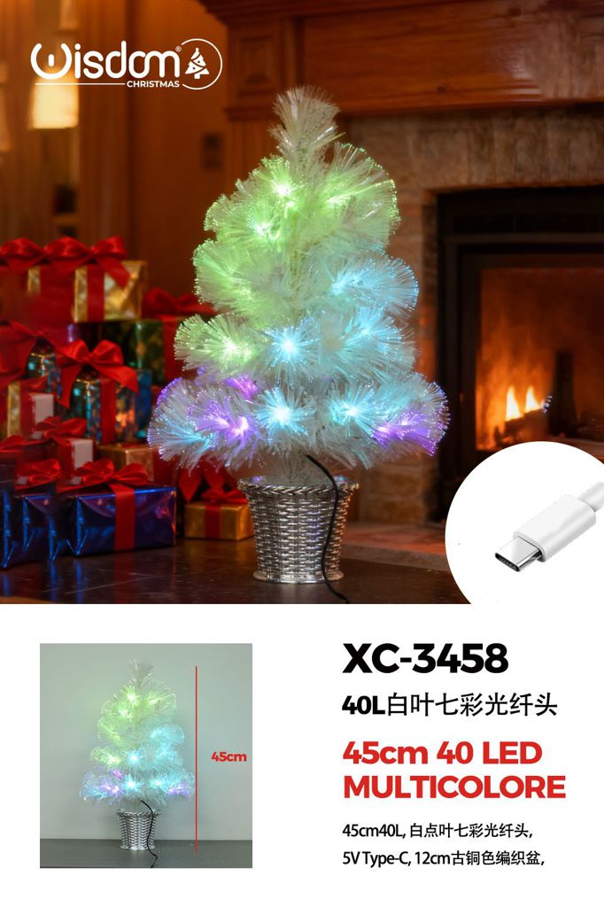 Albero fibra ottica bianco,40 LED multicolor , vaso intrecciato,45 cm, attacco USB