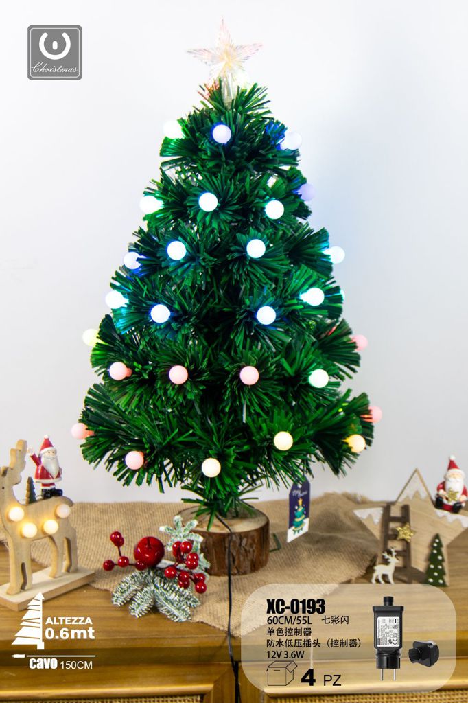 Albero in fibra ottica 55 LED luce multicolor , con palline luminose , controller a 8 funzioni, 60 cm, base legno