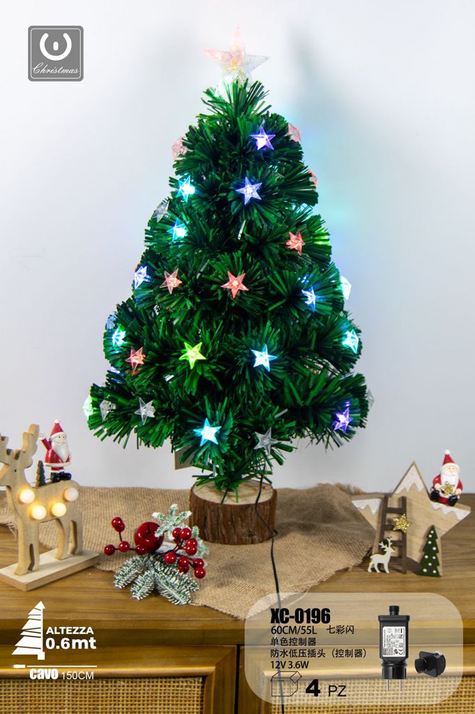 Albero in fibra ottica 55 LED luce Calda , con stelle luminose , controller a 8 funzioni, 60 cm, base legno