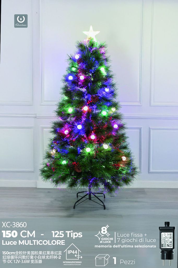Albero in fibra ottica aghi di pino con pigne luminose multicolor , controller a 8 funzioni, di luce 150 cm