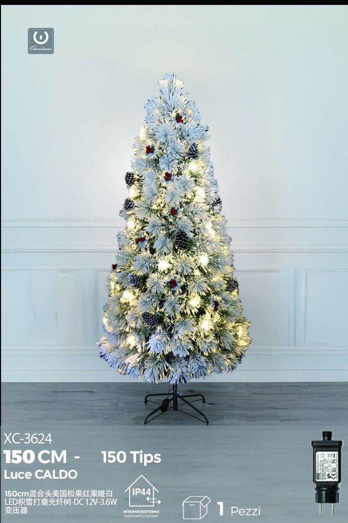 Albero in fibra ottica Bianco Caldo,con aghi di pino bianco e pigne ,150 punte , 150 cm