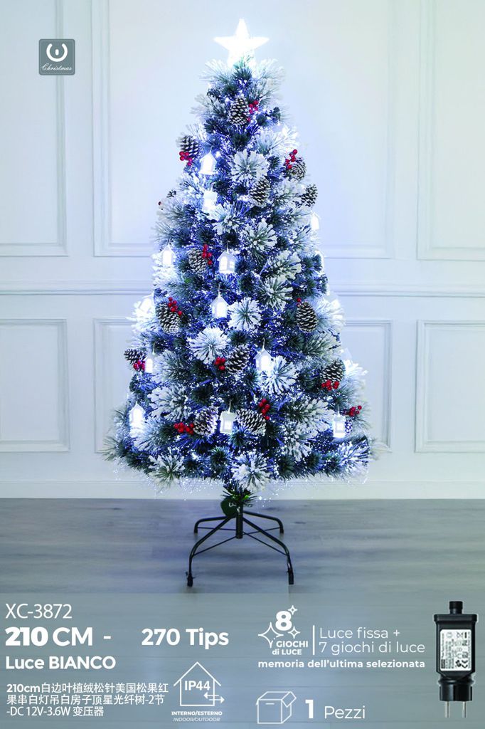 Albero in fibra ottica Luce Bianca 8 giochi di luce ,con aghi di pino con bordo bianco 270 punte , pigne , bacche , luci Bianche ,120 cm