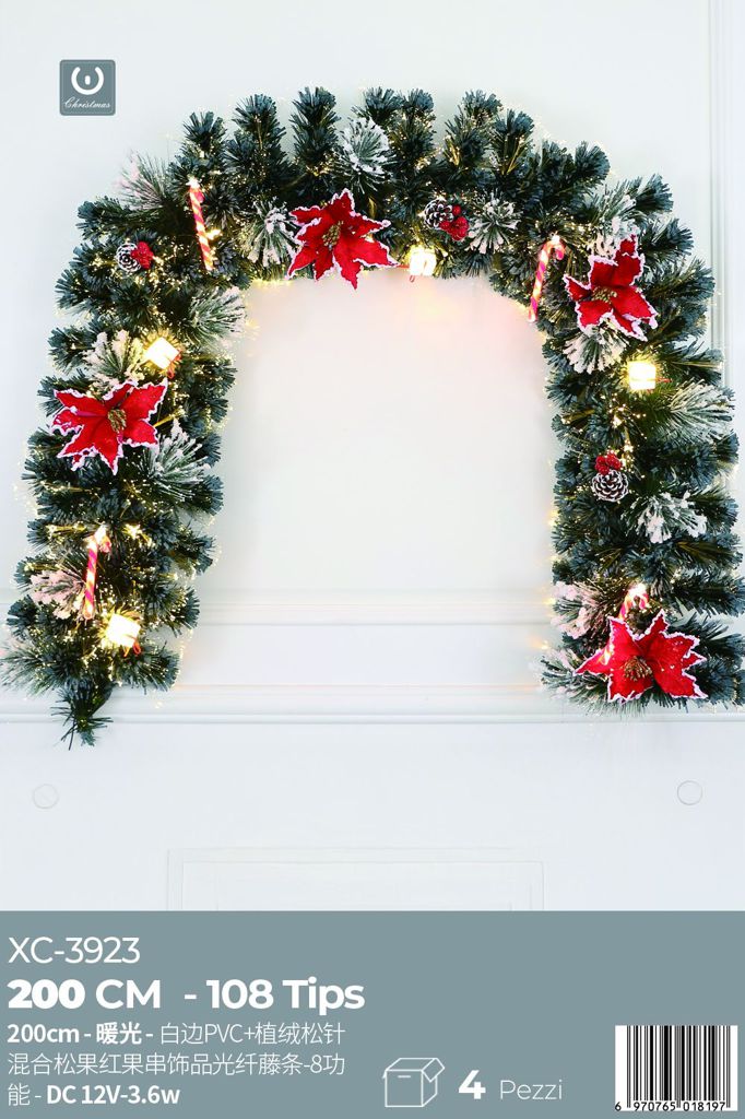 Arco 2 mt, in fibra ottica 108 punte luce Calda , aghi con punte bianche , bacche rosse ,pigne miste , rattan , 8 funzioni