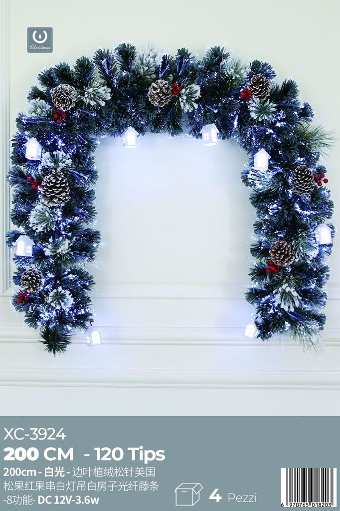 Arco 2 mt, in fibra ottica 120 punte , luce Bianca , bacche rosse ,pigne miste, aghi di pino intrecciati , 8 funzioni