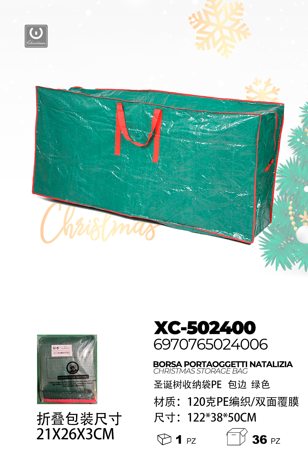 Borsa portaoggetti natalizia verde lucido in tessuto e manici rinforzati dimensioni 122x38x50cm