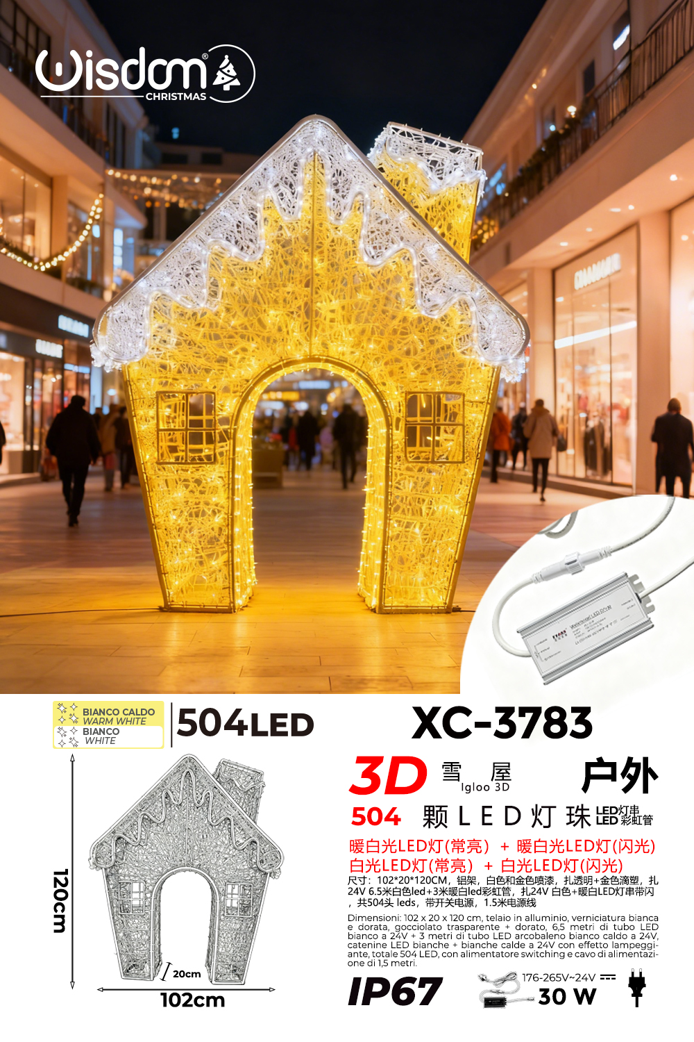 Casa decorativa natalizia 3D 504 luci LED calda fissa e intermittente struttura in alluminio verniciato dimensioni 102x20x120cm IP67 per uso esterno