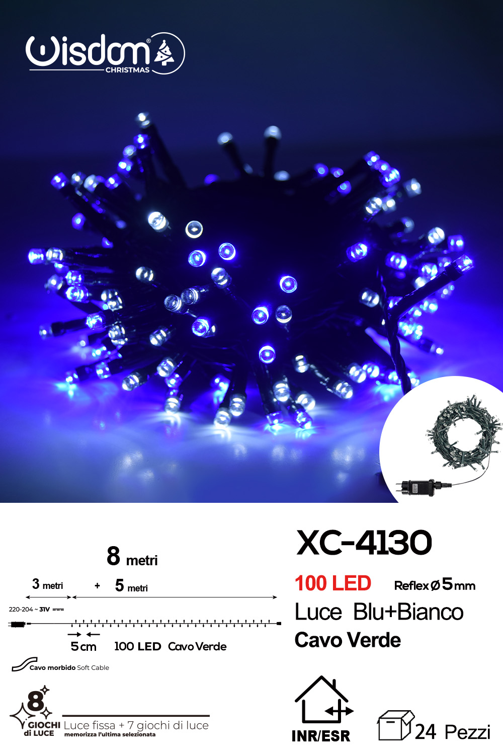 Recensisci per primo “Catena luminosa 100 LED luce blu+bianca da 8 metri con 8 giochi di luce ip44 per uso interno esterno”