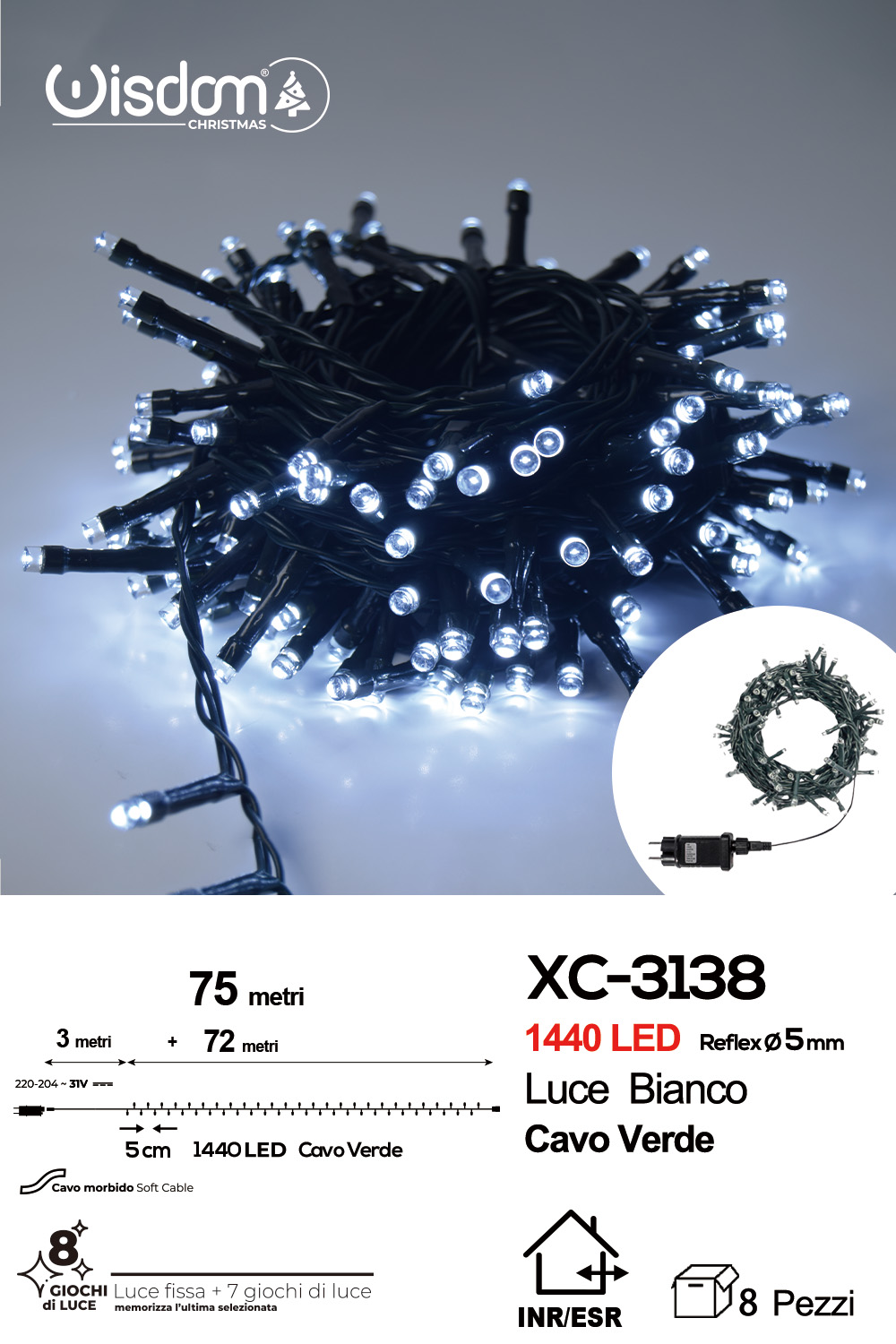 Catena luminosa 1440 LED luce bianca da 75 metri con 8 giochi di luce ip44 per uso interno esterno