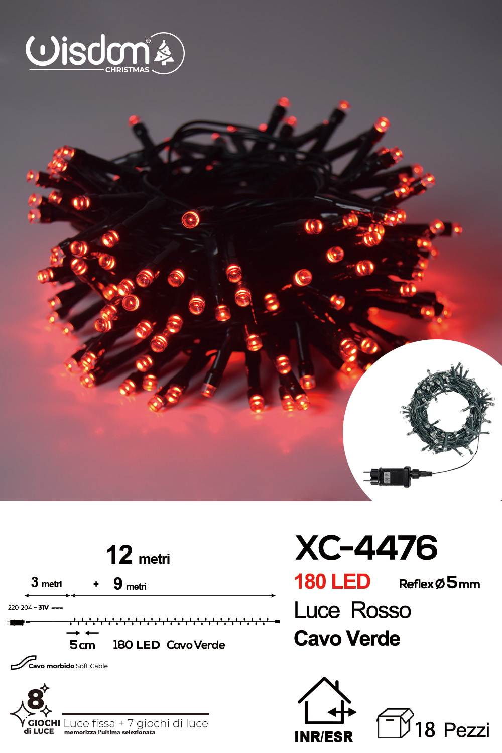 Catena luminosa 180 LED luce rossa da 12 metri con 8 giochi di luce ip44 per uso interno esterno