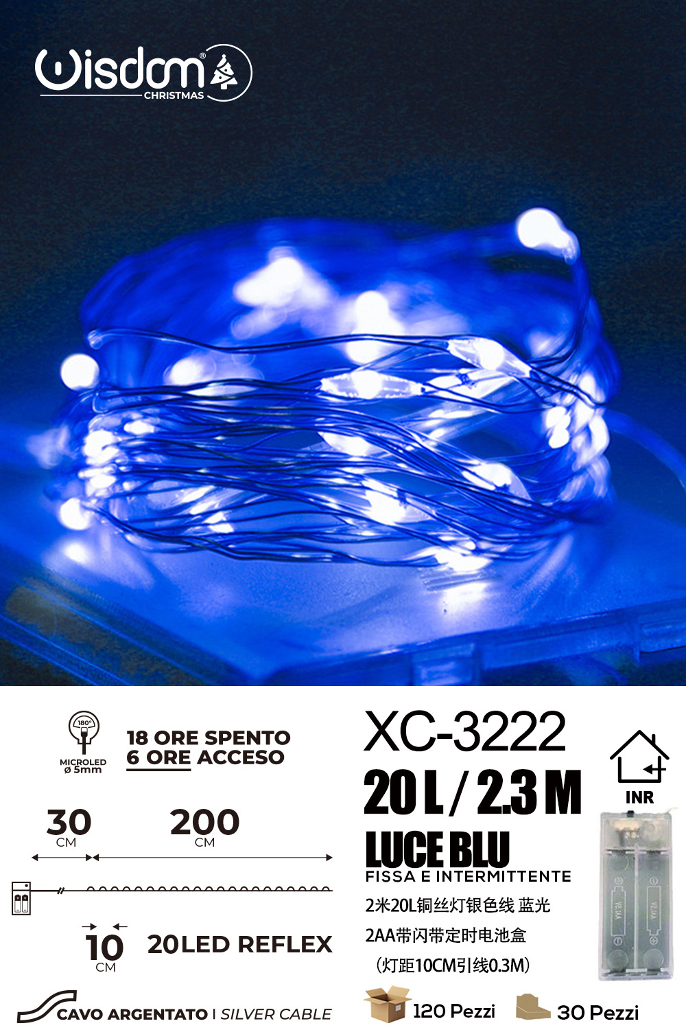 Catena luminosa 20 microLED REFLEX luce blu fissa e intermittente da 2,3 metri alimentazione a pile per uso interno con funzione timer