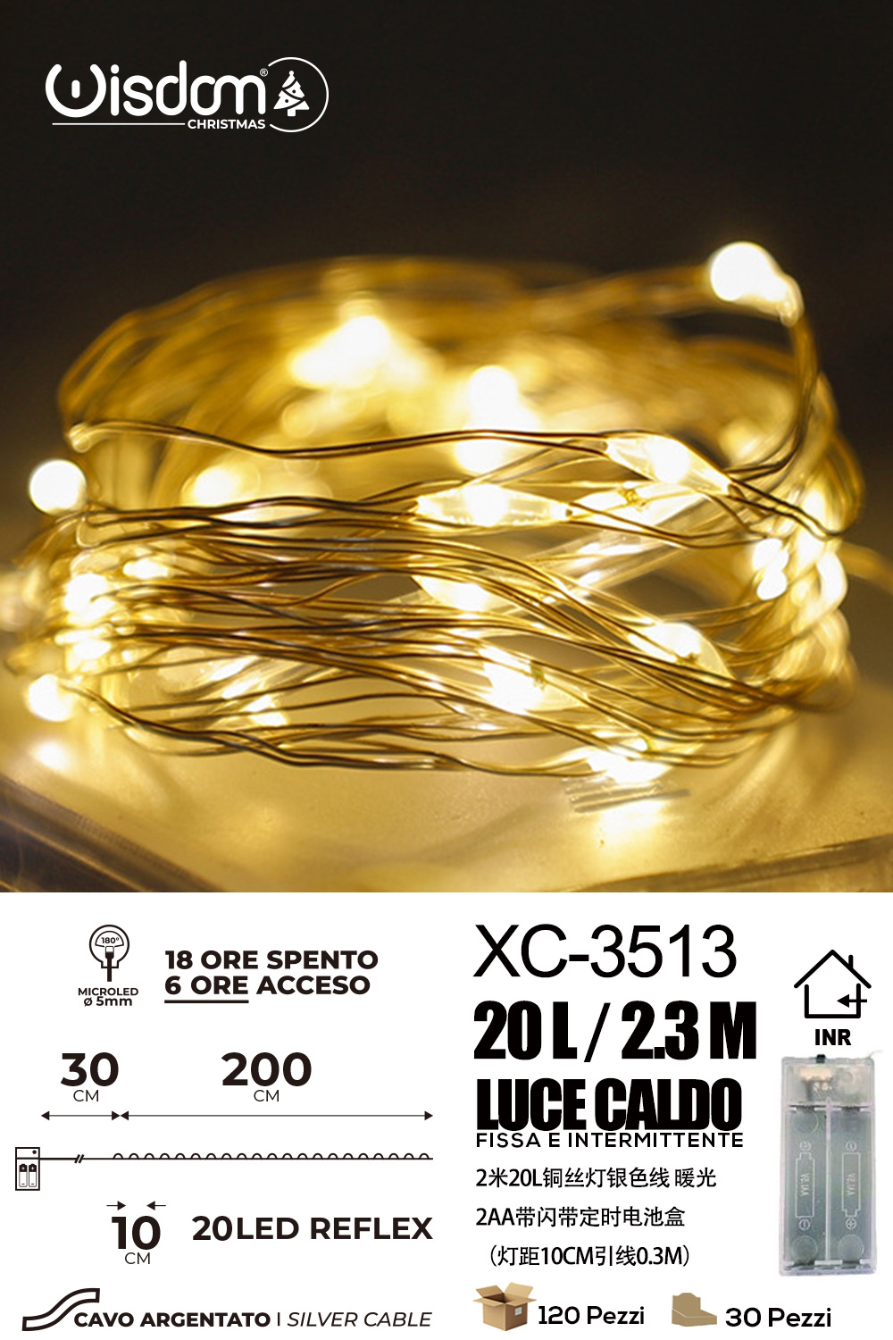 Catena luminosa 20 microLED REFLEX luce calda fissa e intermittente da 2,3 metri alimentazione a pile per uso interno con funzione timer